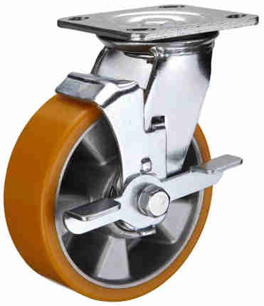 - Galvanized steel brakes are tough and pair well with rubber, polyurethane, or phenolic wheels for general industrial use.