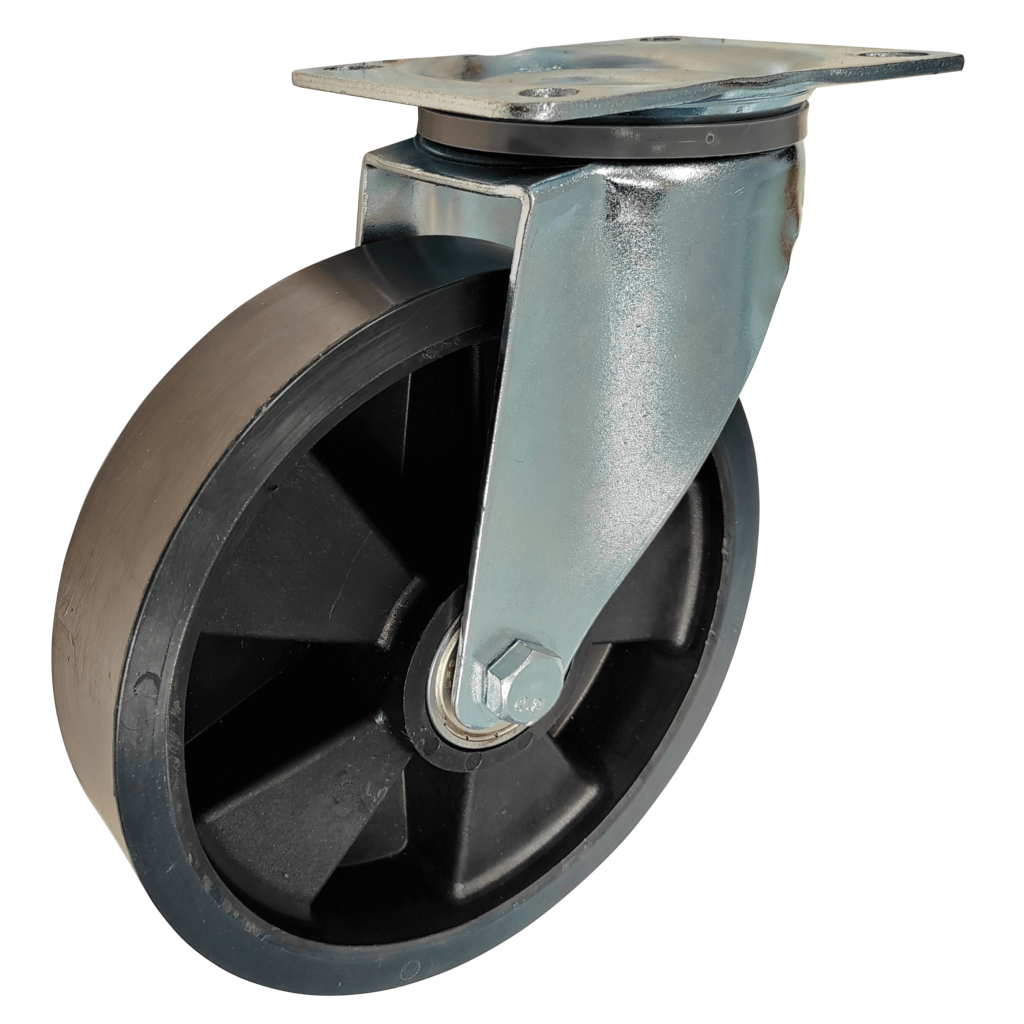 - PA6 + Rubber Sandwich Casters: These innovative wheels incorporate a rubber layer between PA6 materials, creating a “sandwich” structure that provides enhanced shock absorption, grip, and floor protection. The PA6 + rubber combination is highly effective in environments that require both durability and vibration reduction, such as automotive production and material handling in uneven terrain.
