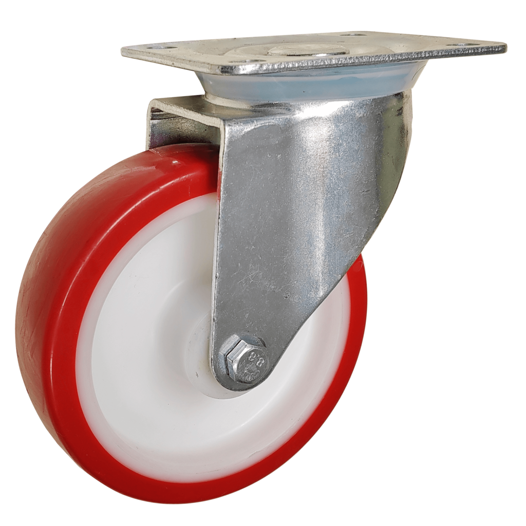 - Red and White PU+PA6 Wheel Casters: These wheels combine the strength of PA6 with a polyurethane (PU) coating, offering an added layer of softness and shock absorption. The PU coating provides extra floor protection and minimizes noise, making these casters suitable for environments such as warehouses, hospitals, and retail spaces where a quieter, non-marking wheel is needed.