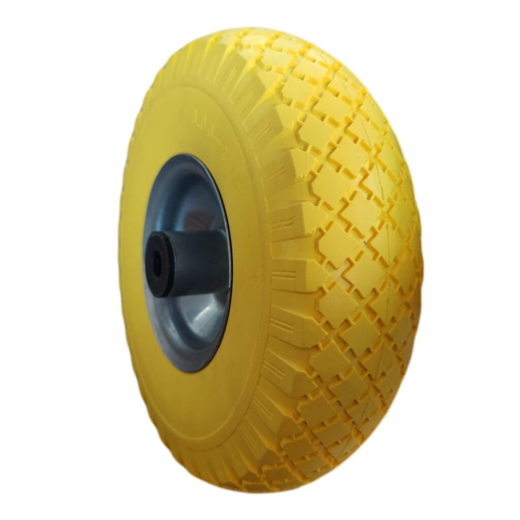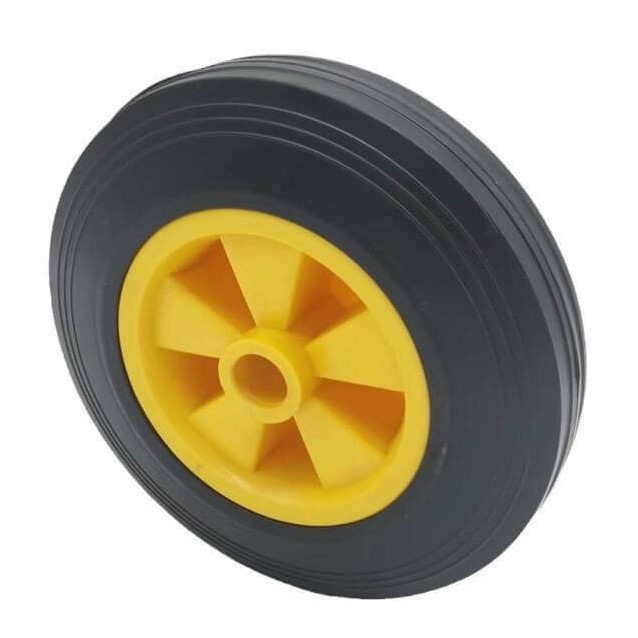 Solid wheelbarrow wheels, often foam-filled, are made from materials like durable rubber, polyurethane, or foam that provide flat-free performance. These wheels are designed to withstand heavy use without the risk of punctures or deflation, offering a maintenance-free experience. While they don’t have the shock absorption properties of pneumatic wheels, foam-filled solid wheels are a reliable, low-maintenance option, especially for flat, smooth surfaces.